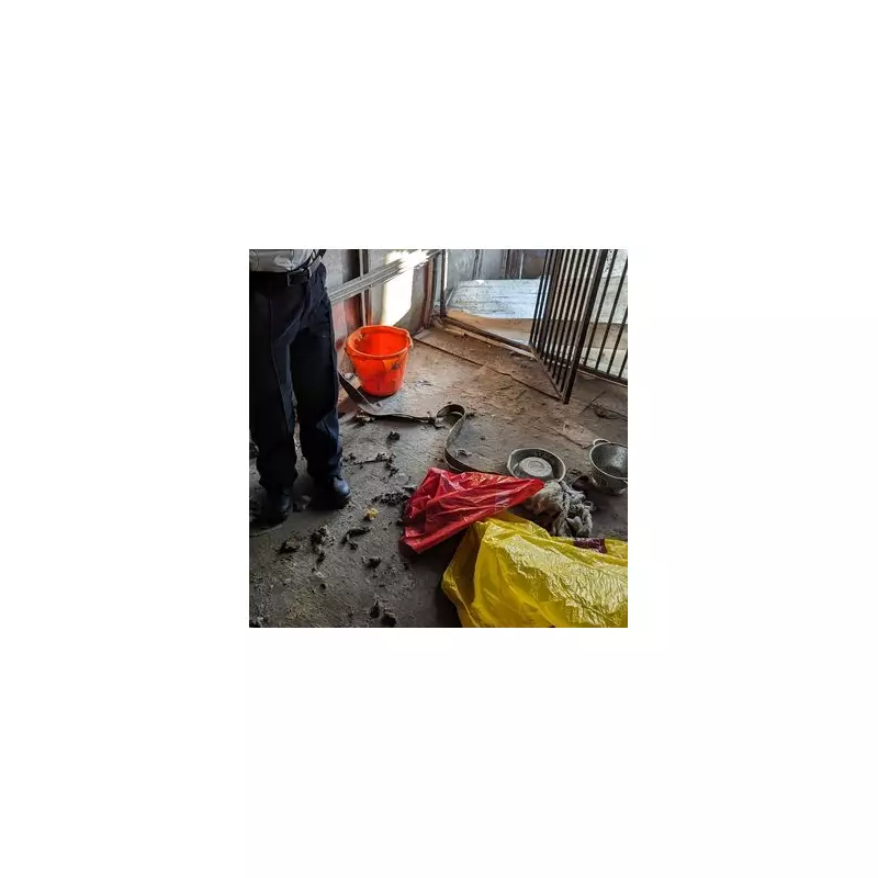 The environment was squalid. Photographic evidence showed a floor encrusted with dog mess, a cluttered garage containing a cage, and structures in severe disrepair where the animals were kept. There was no accessible food or water, and the bedding provided was wholly inadequate for the dogs' needs.