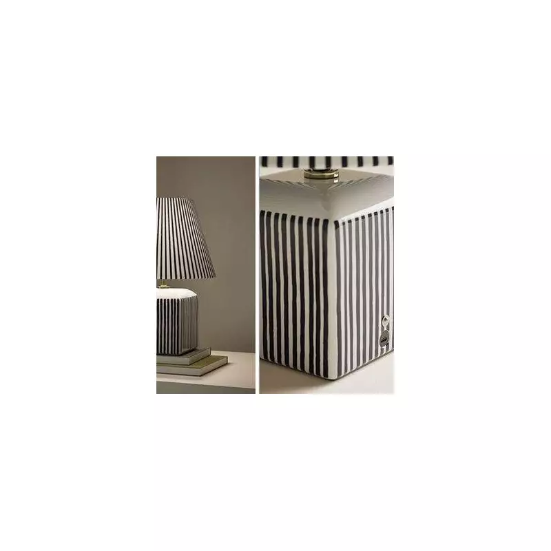 Priced at £49.50, the lamp features a square ceramic striped base with a matching shade, standing at H33.3 cm x W23 cm x L23 cm. Its compact size makes it ideal for various spaces, from bedroom side tables to living room shelves.