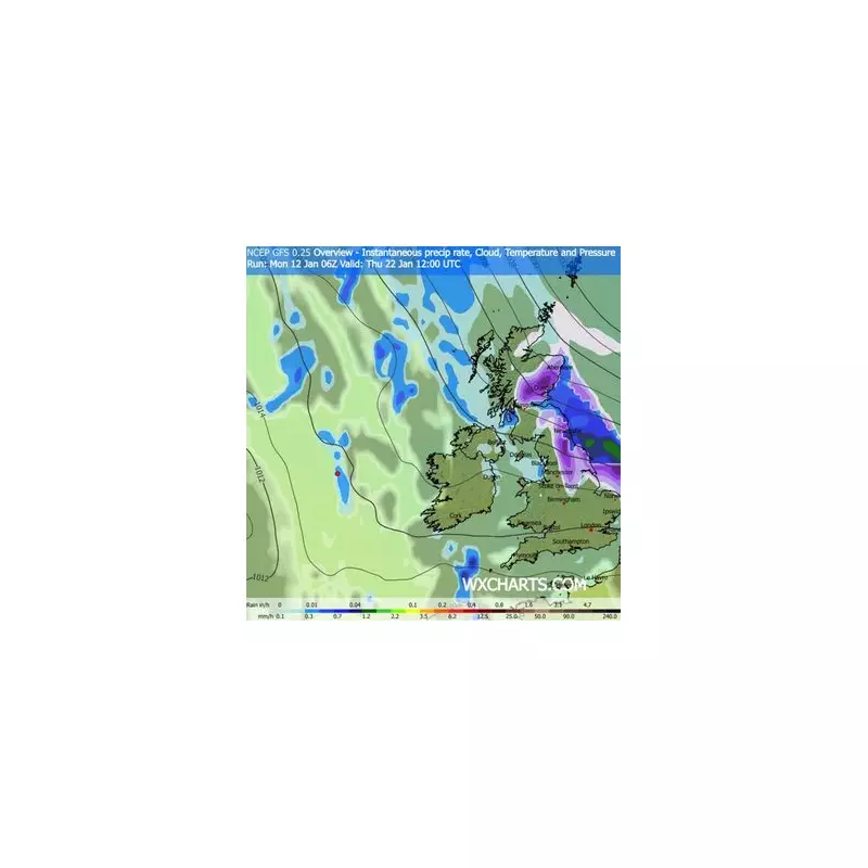 Detailed charts from WXCharts show the snowstorm developing over the UK from January 22nd, intensifying throughout the day and spreading eastwards. The most severe accumulations are anticipated for central and northern Scotland, as well as northern England.